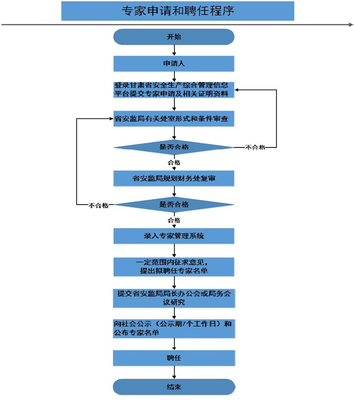 第六條 申請(qǐng)專家由本人自愿提出,省內(nèi)外各級(jí)黨政部門、大專院校、科研院所、行業(yè)組織、企事業(yè)單位均可向省安監(jiān)局推薦專家。在職人員由申請(qǐng)人所在單位推薦,退休人員由原單位推薦,無工作單位的社會(huì)人員須有2名以上現(xiàn)任專家聯(lián)名推薦。專家申請(qǐng)和聘任程序如下: