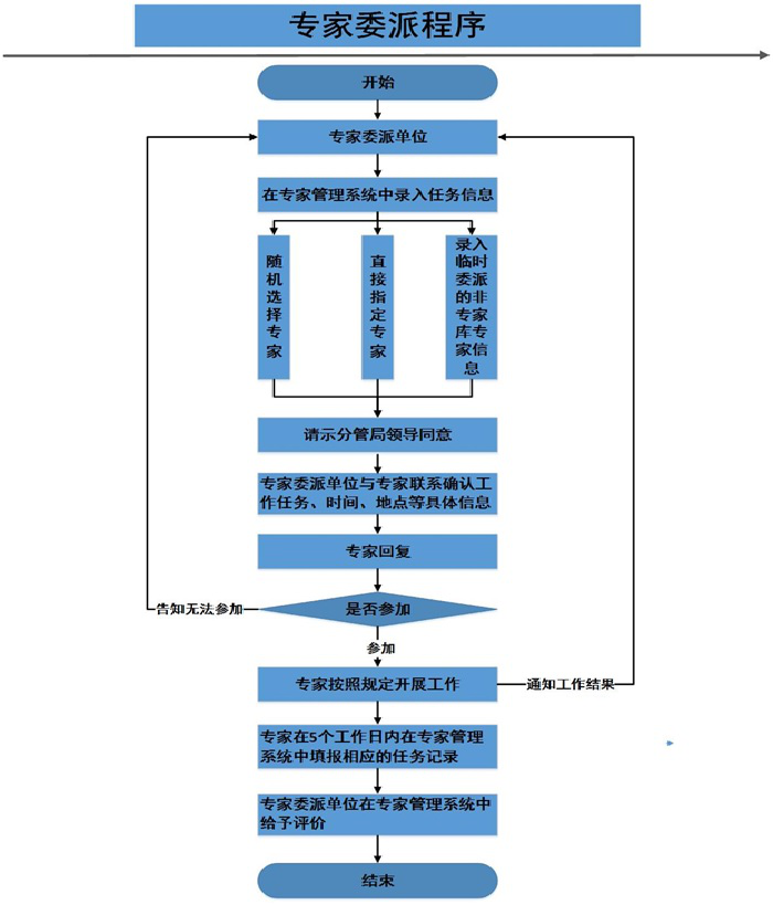 (一)委派專家任務(wù)的單位(省安監(jiān)局機(jī)關(guān)有關(guān)處室、單位,以下簡稱專家委派單位)應(yīng)根據(jù)任務(wù)需要,在專家管理系統(tǒng)中錄入任務(wù)相關(guān)信息,從專家?guī)熘须S機(jī)選擇專家,特殊情況可直接指定專家;專家?guī)鞂<也荒軡M足任務(wù)需要時(shí),專家委派單位在請(qǐng)示分管局領(lǐng)導(dǎo)同意后,可委派專家?guī)熘獾膶<覉?zhí)行委派任務(wù),并在專家管理系統(tǒng)中錄入臨時(shí)委派任務(wù)的專家信息;